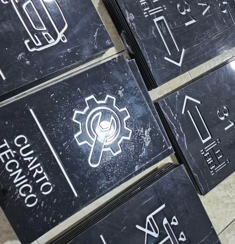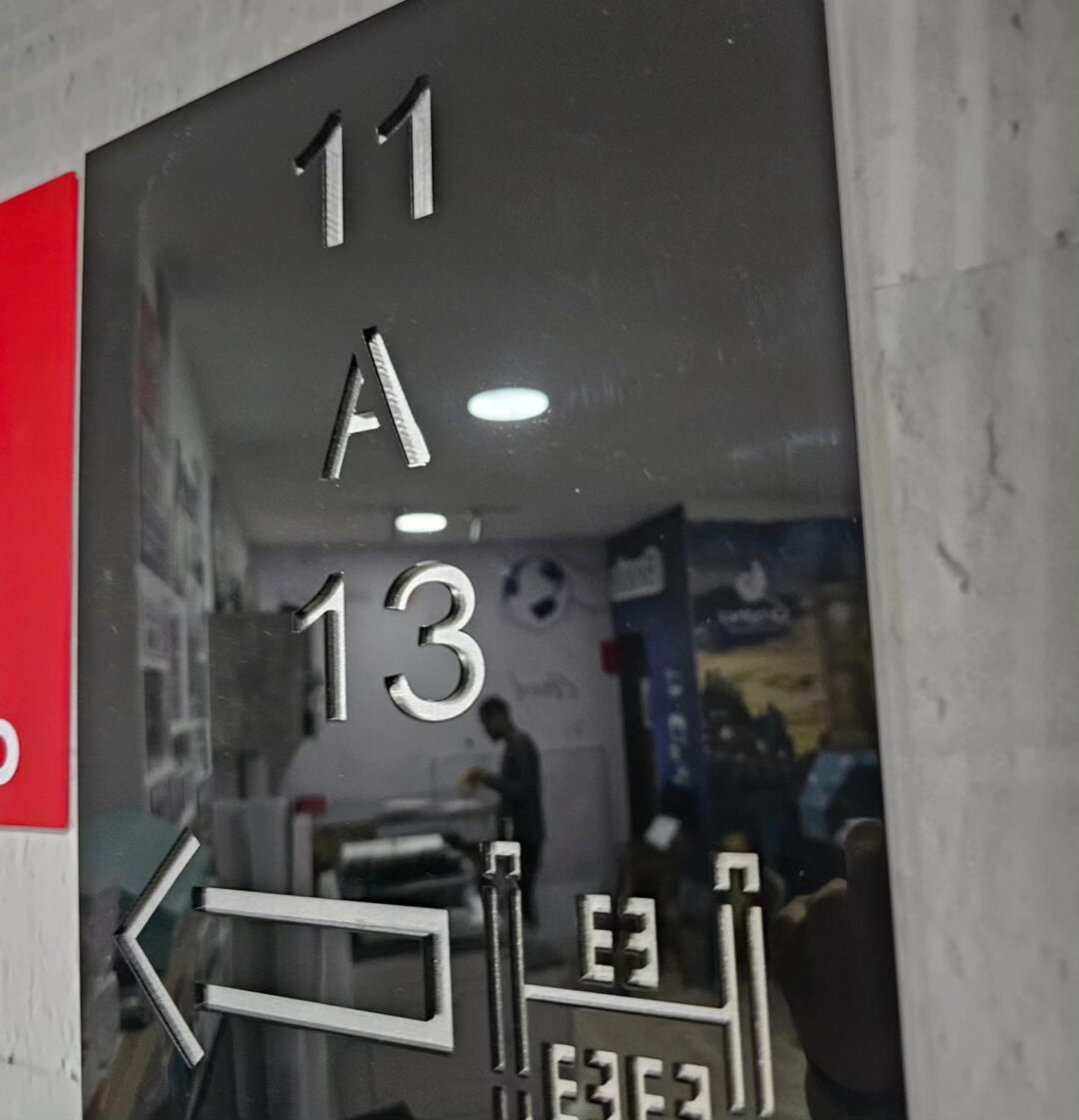 Señales en acrilico cortado en láser, fondo en gris escarchado, señales impresionantes para tu conjunto residencial!
